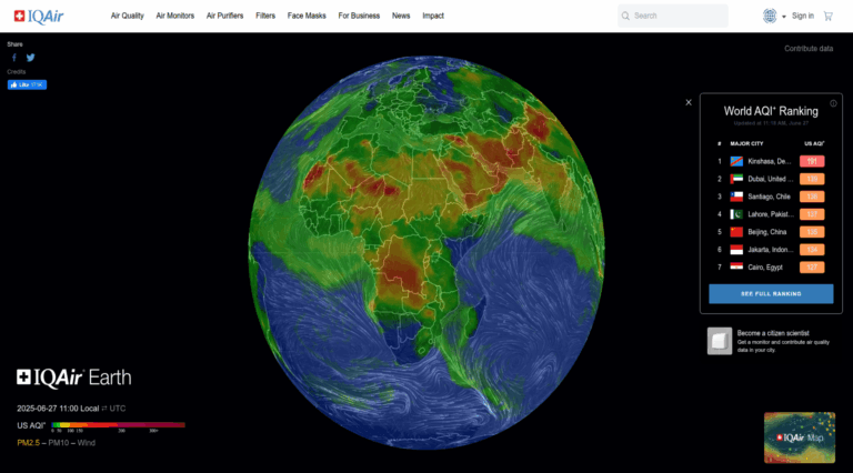 Ever wondered how the global air pollution flow would look like if we were to see it in real-time? This is where AirVisual Earth comes into play. The founder Yann Boquillod created a 3D visualisation based on satellite date originating from mover 8000 monitoring stations to display global air pollution in real-time. One of the prime culprits of pollution is particulate matter (PM in short). Typically PM is followed by a set of digits denoting the size of matter in microns. Essentially, 1 micron is a 1000th of a mm. By comparison, bacteria ranges between 0.3 and 80 microns in size! Now refined particles of the order of PM2.5 are particularly harmful to human beings. because they are so small that they can easily penetrate into the human lungs. Additionally, they are so small that they can easily be dispersed through wind. The following 3D map shows how PM2.5 flows in real-time across the globe. You can tilt (by holding down the mouse button or dragging on the screen) to tilt the globe and you can also use your mouse scroll wheel to zoom in.